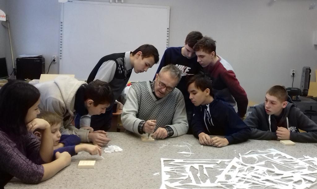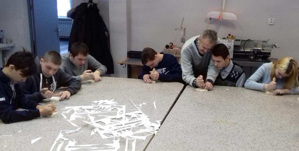 Согласно плану воспитательной работы с учащимися на зимние каникулы, 28.12.2018г. педагогами Акбировой Г.Т. и Тимургалиевой Д.А. для учеников 8а,8б классов был организован выход в Центр детского технического творчества №5. Ребята приняли участие в мастер-классе «Резьба по дереву», который провёл для них педагог дополнительного образования Ермолаев Петр Михайлович. Каждый ребёнок смог лично поработать с инструментами и выполнить геометрическую резьбу по дереву.