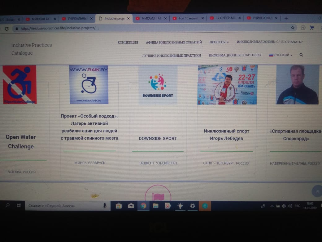 Педагог ГБОУ Набережночелнинской школы №69 учитель физической культуры Татаркин Михаил представил реально-действующий проект и отразил многолетний опыт физкультурно-спортивной деятельности по видам спорта. Впереди в 2019 году пройдут очередные и традиционные фестиваль и конкурсы по лучшим проектам и инклюзивным практикам, спорту и афишным публикациям, лучшие сайты и ютуб каналы будут представлены в формате транслирующего компонента по информационному обмену опытом спортивно-оздоровительной деятельности между международными общественными организациями по тематикам: инклюзивная жизнь: с чего начать? (авторские статьи), инклюзивные события (фестивали, выставки, мастер-классы и др.); социальные проекты; арт-инклюзия; инклюзивный спорт; творческие инклюзивные коллективы; лучшие инклюзивные практики; чем могут помочь СМИ?, финансирование инклюзивных проектов.