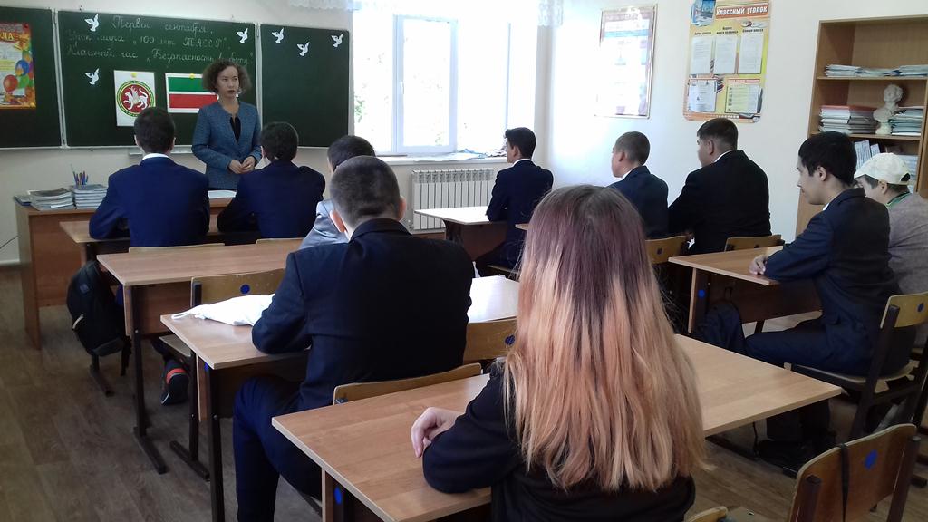 Согласно воспитательному плану мероприятий 02.09.2019г. в 9б классе НШ №69 педагогом Акбировой Г.Т. был проведён Урок мира по теме «100 лет ТАССР». Цели и задачи данного мероприятия: познакомить с историей образования ТАССР, с экономической и политической ситуацией в республике; развивать и приумножать лучшие качества человека: патриотизм, гражданственность, гордость за свою Родину, работать над развитием внимания, познавательного интереса; способствовать воспитанию уважения к истории своего края. Ребята посмотрели презентацию по данной теме, приняли активное участие в беседе.