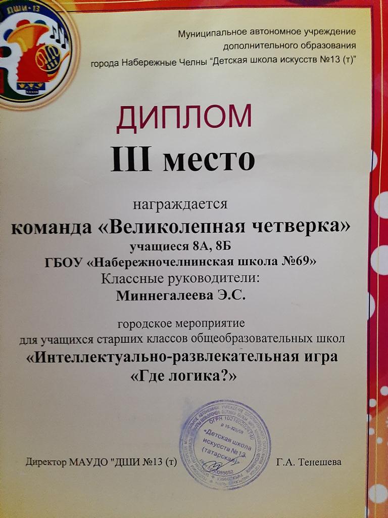 Опубликовано: 31.10.2019Ученики 8 класса под руководством Миннегалиевой Э. С. приняли участие в интеллектуально-развлекательной игре "Где логика?", которая прошла в ДШИ №13.