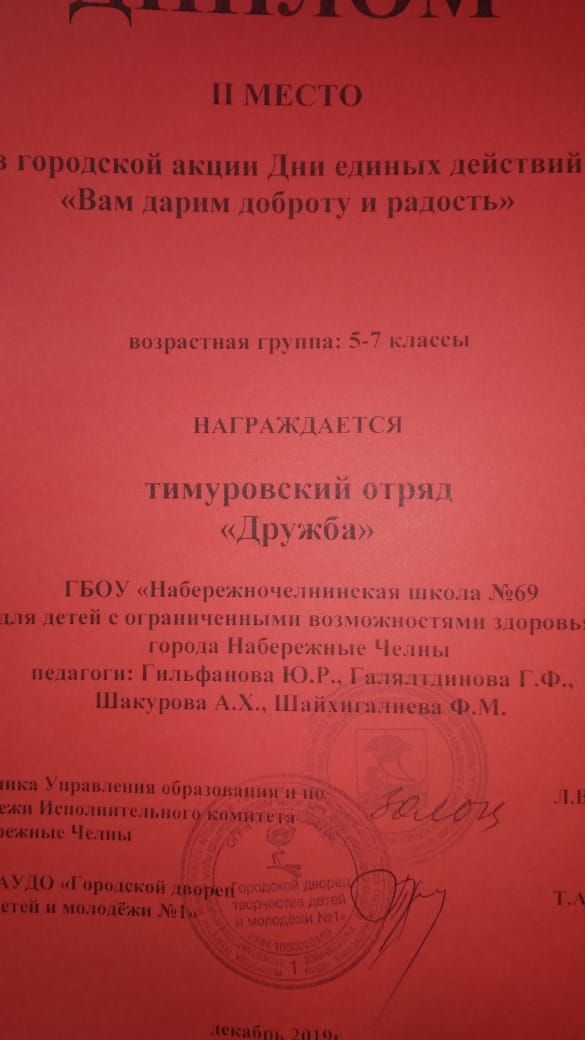 Опубликовано: 11.12.201911 декабря тимуровский отряд "Дружба" (ученики 6 классов) заняли почётное 2 место в городской акции Дни единых действий "Вам дарим доброту и радость".