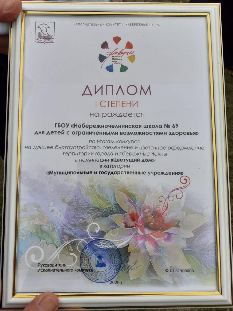 Опубликовано: 30.08.202030.08.2020 прошло награждение руководителей муниципальных и гос.учреждений по итогам конкурса на лучшее благоустройство, озеленение и цветочное оформление. В номинации "Цветущий дом" школа №69 награждалась дипломом I степени.