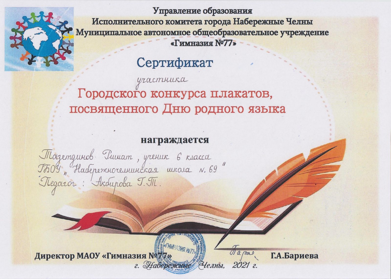 Опубликовано: 02.03.2021Согласно плану мероприятий в рамках декады МО учителей общеобразовательных дисциплин 24.02.2021-05.03.2021 под руководством учителя русского языка и литературы Акбировой Г.Т. ученик 6а класса Тазетдинов Р. принял участие в городском конкурсе плакатов и стенгазет, посвящённых Международному дню родного языка. Награждён сертификатом за участие.