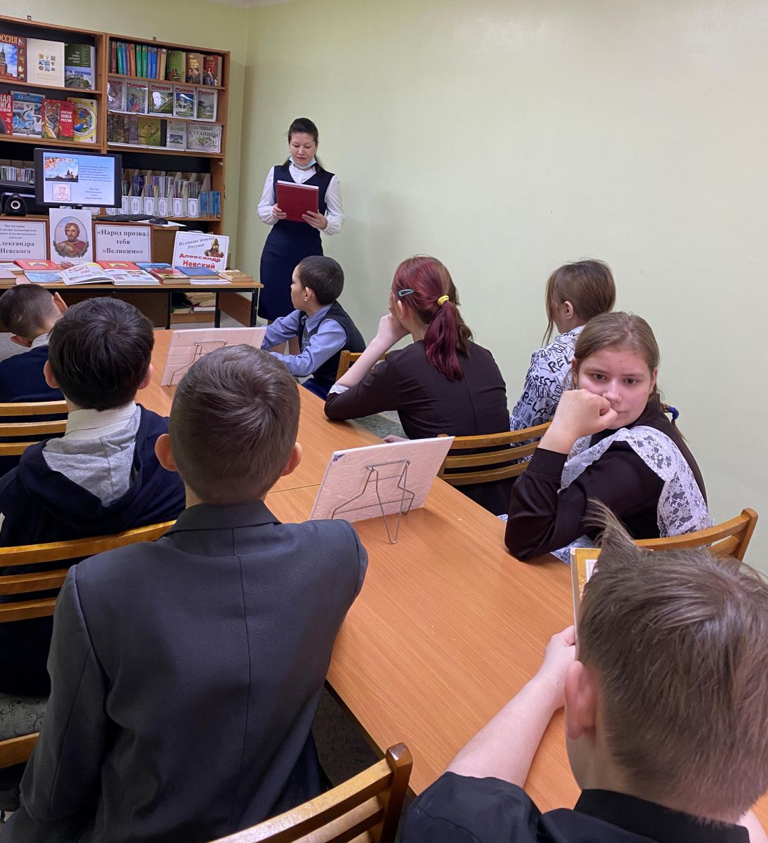 Цель мероприятия - формирование у учащихся чувства патриотизма, гражданственности, уважения к прошлому на примере Александра Невского. В ходе мероприятия библиотекарь рассказала о детстве Александра, о его воспитании и обучении ратному делу, об исторических событиях, связанных с ним – о Невской битве, Ледовом побоище на Чудском озере; об Орден Александра Невского, который является единственной наградой, существовавшей в наградных системах Российской империи и существующей в Российской Федерации. Ребята просмотрели видеофрагмент фильма «Александр Невский» С.М. Эйзенштейна, участвовали в викторине «Верите? Не верите?». В игре «Собери крылатую фразу» составляли знаменитые фразы великого полководца. Завершили мероприятие прохождением электронной квест-игры «Жизнь и подвиги Александра Невского». Мероприятие сопровождалось электронной презентацией. Была оформлена одноименная книжная выставка.