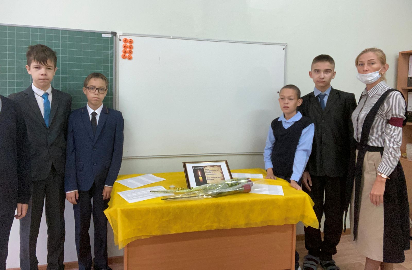 Опубликовано: 07.09.2021Педагогом Брюховой С.С. в 7В классе был проведен урок «Науки и технологии». Также с учащимися был оформлен уголок «Помним, скорбим, Беслан».