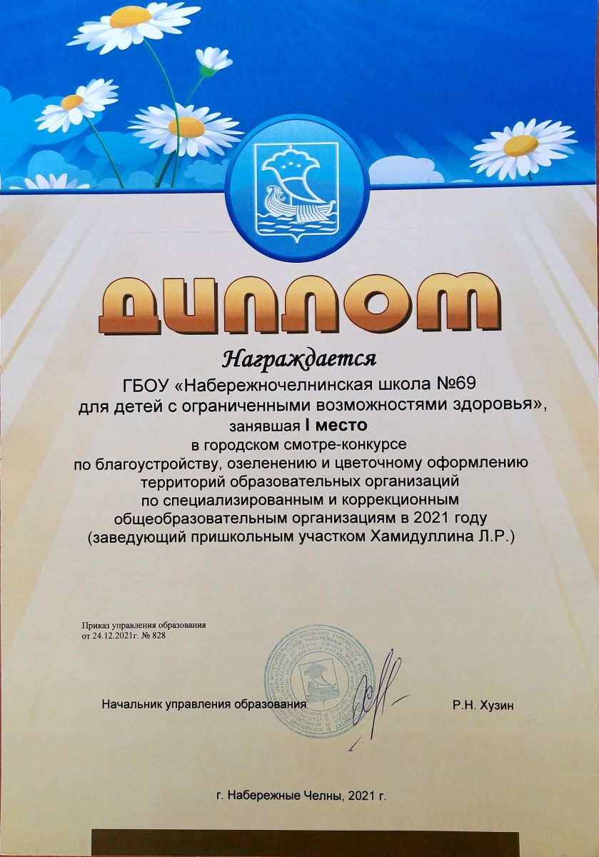 Опубликовано: 27.01.2022Школа №69 заняла I место в городском смотре-конкурсе по благоустройству, озеленению и цветочному оформлению территорий образовательных организаций по специальным и коррекционным организациям в 2021 году (зав. пришкольным участком Хамидуллина Л.Р.)