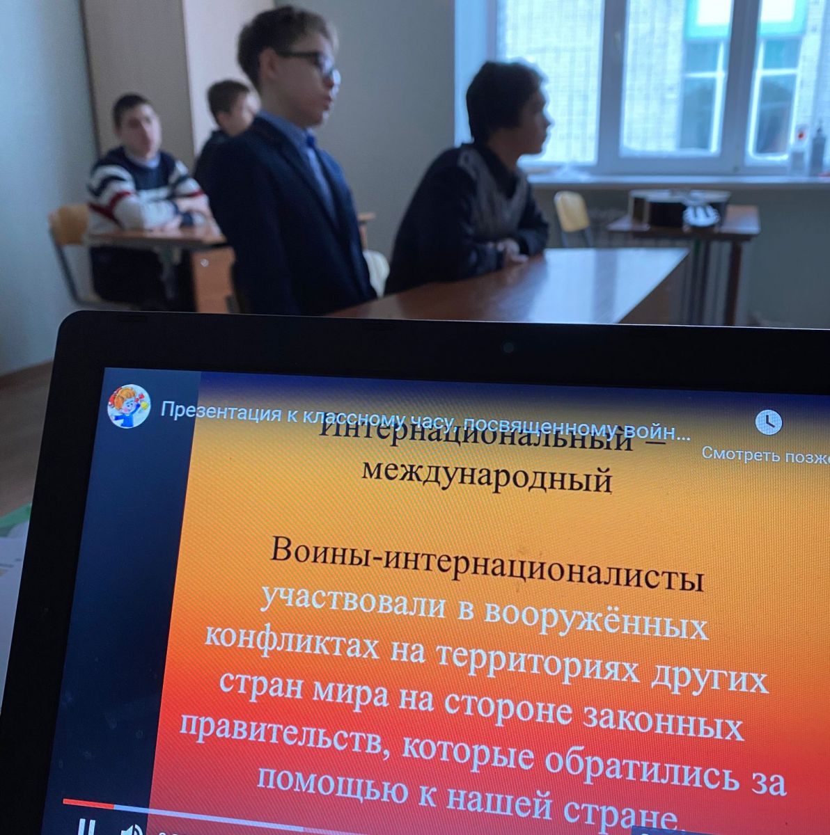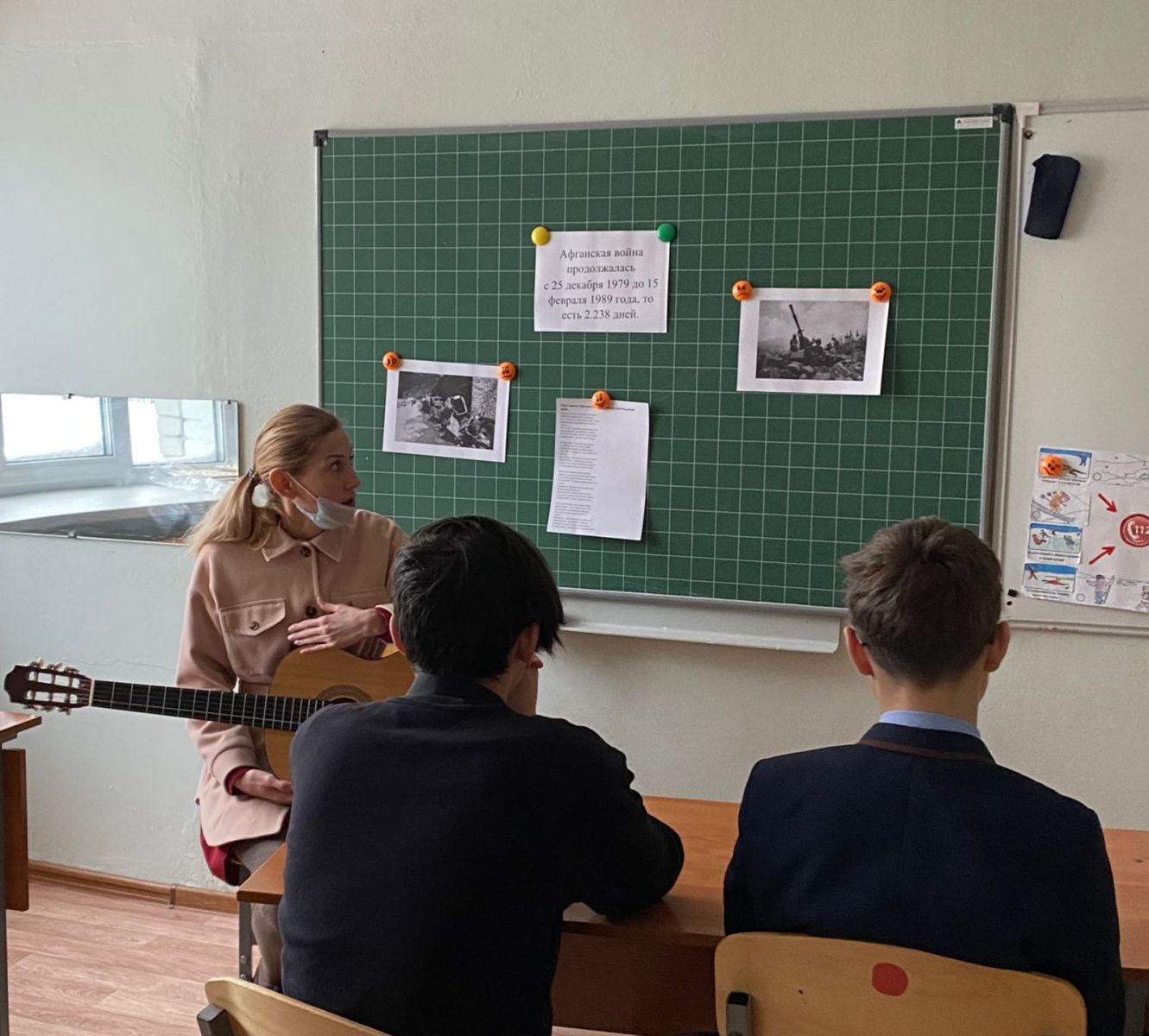 Педагогом Брюховой С.С. для 7б и 7в классов был проведён классный час на тему «России верные сыны». Учащиеся узнали о боевых подвигах своих соотечественников, понятии «честь», «долг». Прослушали песню «Афганистан - красивый, дикий, горный край».