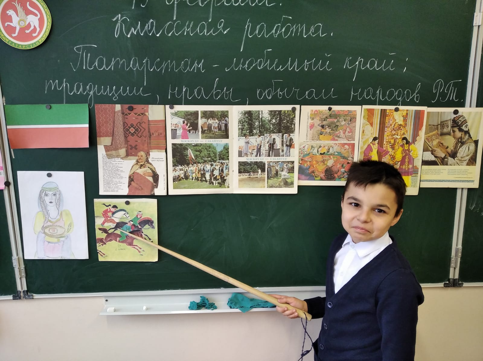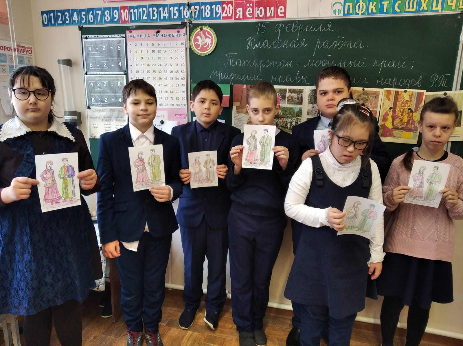 Опубликовано: 15.02.202215 февраля 2022 года в рамках проведения Международного дня родного языка учителями 3, 4 классов был проведен единый классный час «Татарстан – любимый край: традиции, нравы, обычаи народов РТ». Учащиеся познакомились с традициями, обычаями народов республики Татарстан, узнали о флаге, гербе, гимне нашего государства. Просмотрели презентацию о любимом крае, о его богатствах, о национальных костюмах народов РТ, затем раскрасили рисунок, где были изображены юноша и девушка в татарских национальных костюмах.