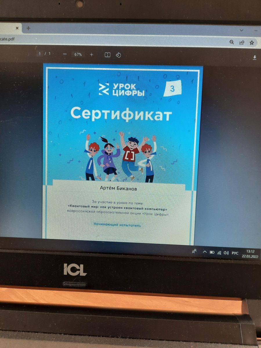 Опубликовано: 22.03.202222.03.2022г. в 7а классе педагогом Акбировой Г.Т. был проведён Урок цифры «Квантовый мир: как устроен квантовый компьютер». Ребята посмотрели тематическую видеолекцию и попробовали свои силы в тренажёре. Успешно справившись с заданиями, получили сертификат.
