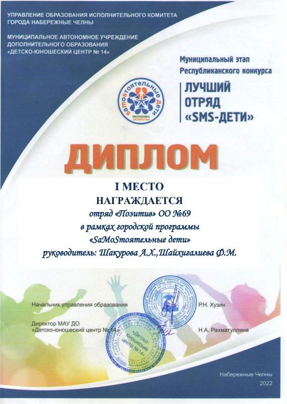 Опубликовано: 19.05.202219.05.2022 г. Отряд "Позитив" (руководители: Шакурова Айсулу Хамитовна и Шайхигалиева Фания Мизхатовна) был признан "Самым Лучшим Отрядом "SaMoSтоятельные Дети" города Набережные Челны и награждён Дипломом за 1 место на муниципальном этапе конкурса. Ученики нашей школы приложили много усилий, для того чтобы стать первыми. Они старались быть позитивными, активными в делах.