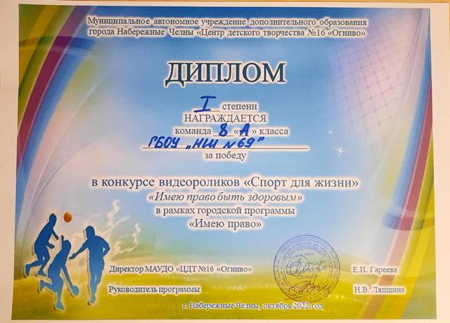Опубликовано: 08.11.2022В октябре 2022 года обучающиеся 8а класса под руководством педагога Акбировой Г.Т. приняли активное участие в конкурсе видеороликов «Спорт для жизни» («Имею право быть здоровым!») в рамках городской программы «Имею право». По итогам конкурса команда награждена дипломом за I место.