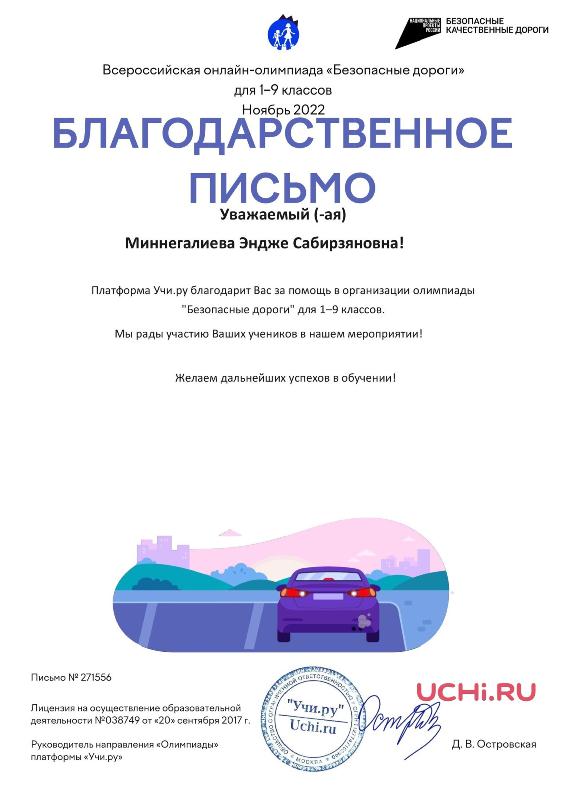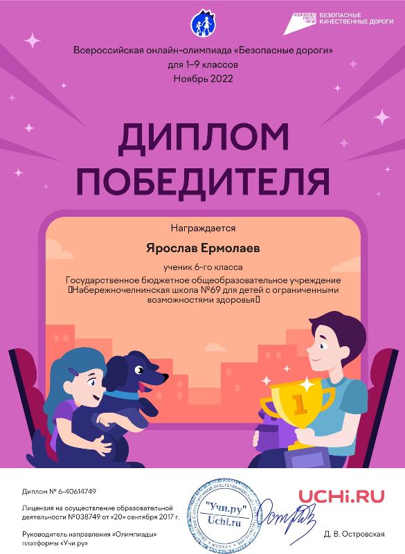 Опубликовано: 29.11.2022Учащиеся 6б класса под руководством классного руководителя Миннегалиевой Э.С. приняли активное участие во Всероссийской онлайн-олимпиаде «Безопасные дороги» и заняли призовые места.