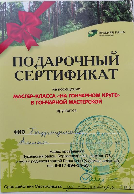 Подарочный сертификат на посещение мастер-класса был вручен ученице за победу в региональном конкурсе рисунков «Есть на свете красота – заповедные места!», который был проведён национальным парком «Нижняя Кама» в рамках Всемирного дня защиты животных и Дня работников заповедного дела в России.