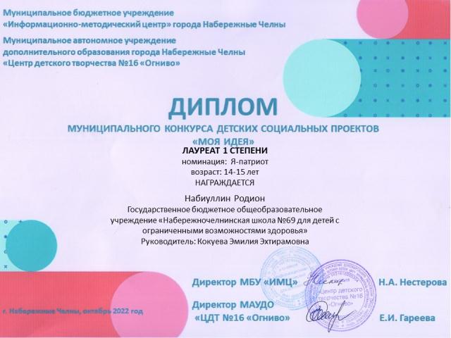 Опубликовано: 27.01.2023Учащийся 7Б класса Набиуллин Р. под руководством Кокуевой Э.Э. награждён Дипломом 1 степени за участие в муниципальном конкурсе детских социальных проектов, направленных на военно-патриотической воспитание подрастающего поколения "Я-патриот России".