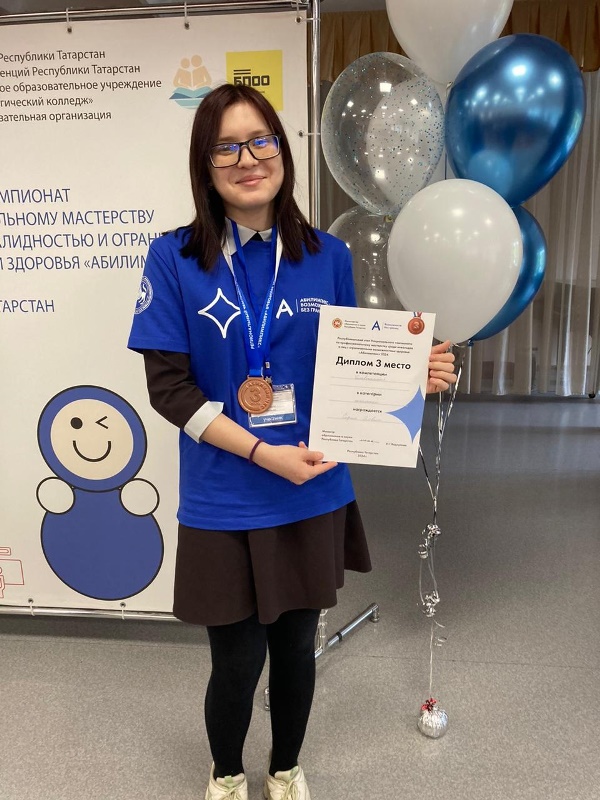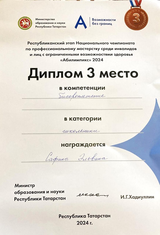 Опубликовано: 24.04.202424.04.2024 г. ученица 9а класса Сафина Эльвина в сопровождении наставника Ахметяновой Р.Т., на базе «Набережночелнинского педагогического колледжа», участвовала в Республиканском чемпионате по профессиональному мастерству среди лиц с инвалидностью и ограниченными возможностями здоровья «Абилимпикс» по компетенции «Бисероплетение». В результате Сафина Эльвина получила Диплом за 3 место и бронзовую медаль.