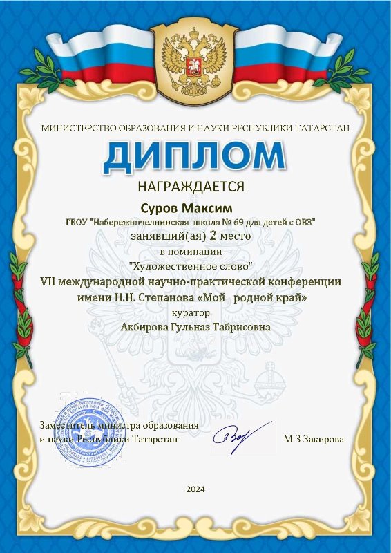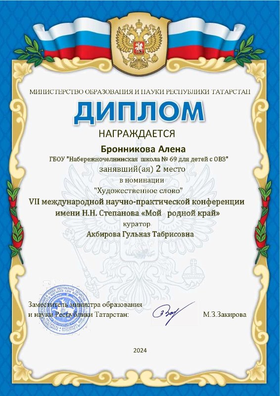Опубликовано: 23.05.2024В апреле 2024 года обучающиеся 7а класса Бронникова Алёна и 8а класса Суров Максим под руководством учителя русского языка и литературы Акбировой Г.Т. приняли активное участие в Международной VII научно-практической конференции имени Н.Н. Степанова «Мой родной край», которая была организована ГБОУ «Лениногорская школа № 14 для детей с ОВЗ». Ребята выступили в секции «Творческая мастерская духовно-нравственного воспитания» в номинации «Художественное слово». По итогам мероприятия ученики награждены дипломами за II место.