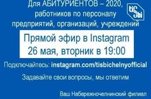 26 мая в 19.00 Набережночелнинский филиал Университета управления «ТИСБИ» проводит прямую связь в Instagram по вопросам организации приёма абитуриентов 2020 года на направления подготовки бакалавриата (высшее образование) и специальности СПО (колледж).