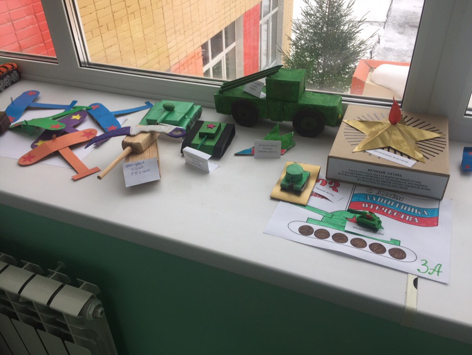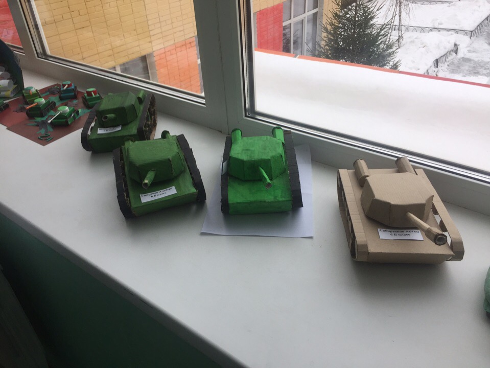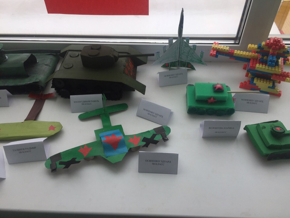 Была оформлена выставка макетов военной техники. Ребята смастерили их из самых разных материалов: картона, бумаги, пенопласта, соленого теста, фольги, пластилина, пластиковых тарелок и даже, из мешков для лука. Фото1 фото2 фото3