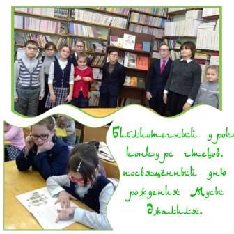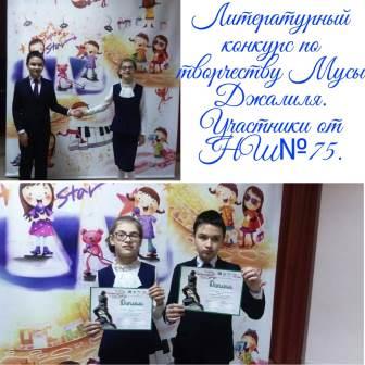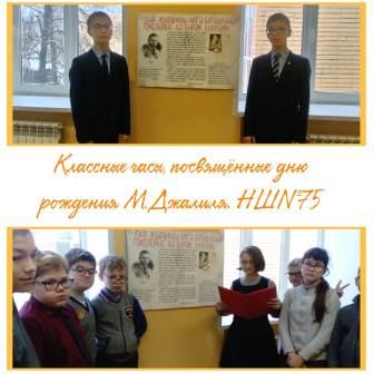 В школе прошли мероприятия, посвященные 113-летней годовщине со дня рождения поэта-героя Мусы Джалиля: классные часы, библиотечные уроки, конкурс чтецов. Также наши ребята участвовали в литературном конкурсе по творчеству Мусы Джалиля. Также посетили музей - выставку, посвященную 113 годовщине со дня рождения поэта - героя. Фото1 фото2 фото3 фото4