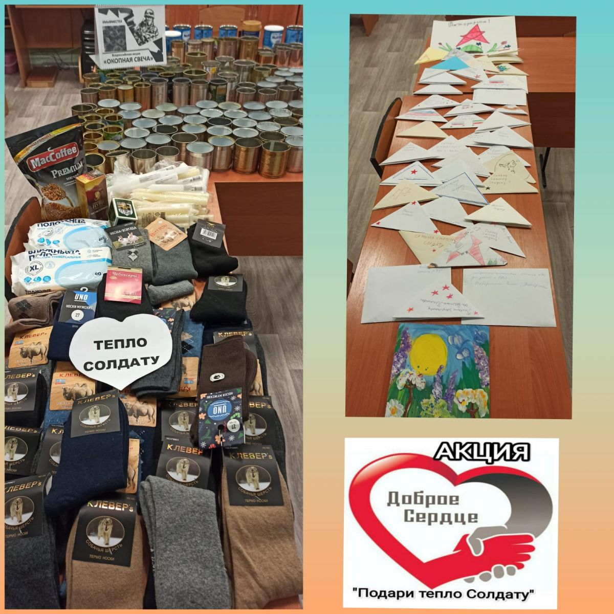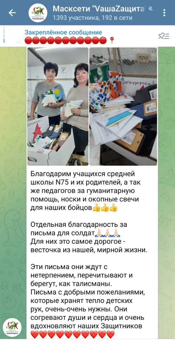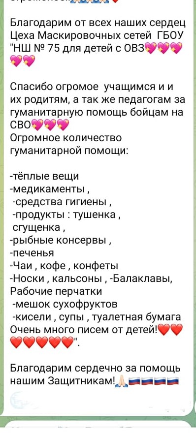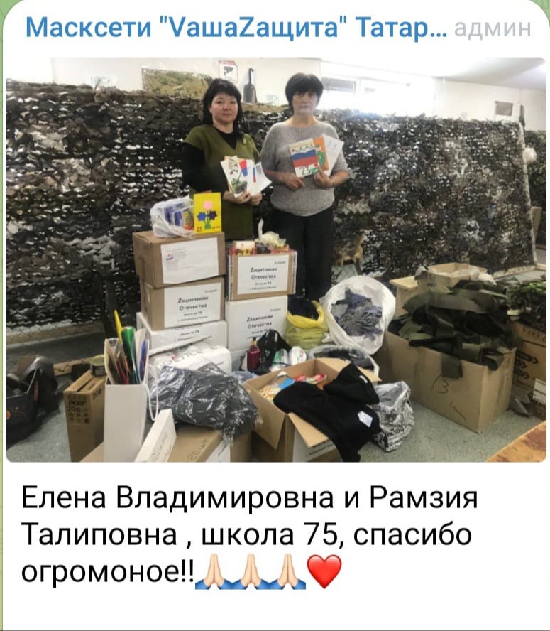 В течении января учащиеся нашей школы, родители, работники школы принимали участие в акции "Подари тепло солдату". Вся оказанная помощь была передана в цех по изготовлению маскировочных сетей (26/10 блок Д). Вместе с сетями письма, тёплые вещи будут доставлены гуманитарным конвоем на фронт. Благодарим искренне каждого, кто откликнулся и внёс свой добрый вклад.