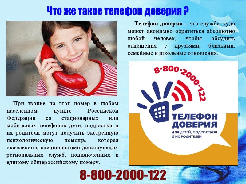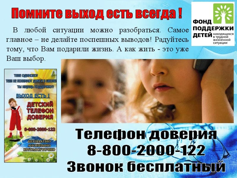 Единый многоканальный телефон доверия для детей, подростков и их родителей 8-800-2000-122.