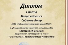 В рамках городской программы " Музейный вернисаж" и работы школьного музея "Родник жизни", ученик 3 класса Садыков Амир принял участие в городском конкурсе экскурсоводов" Редкий музейный экспонат" и занял достойное 1 место.