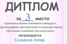Очередная Победа ученика 3 класса Садыков Амира. Всей семьей они приняли участие в региональном конкурсе "Большое семейное путешествие" Поздравляем, вперед к новым Победам.