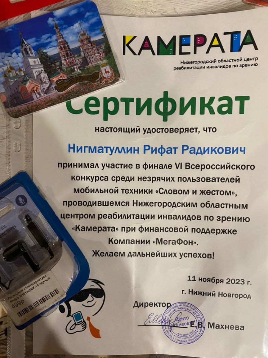Рифат Нигматуллин, ученик 11 класса, прошел обучение по курсу "Универсальный мобильный помощник" (для незрячих и слабовидящих людей). Он успешно справился с заданиями отборочного этапа по Республике Татарстан и попал в финал конкурса. Финал VI всероссийского конкурса "Словом и жестом" состоялся 11 ноября в Нижнем Новгороде. VI всероссийский конкурс "Словом и жестом" организован в рамках проекта "Универсальный мобильный помощник", который реализуется Нижегородским областным центром реабилитации инвалидов по зрению "Камерата" в партнерстве с некоммерческими организациями из регионов России при поддержке ПАО "МегаФон".