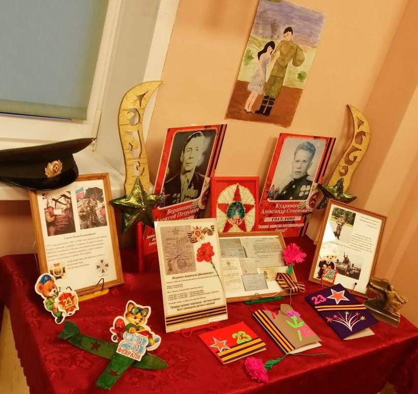 В рамках военно-патриотического месячника ребята Тимуровского отряда "Данко" оформили выставку "День памяти героев Отечества"