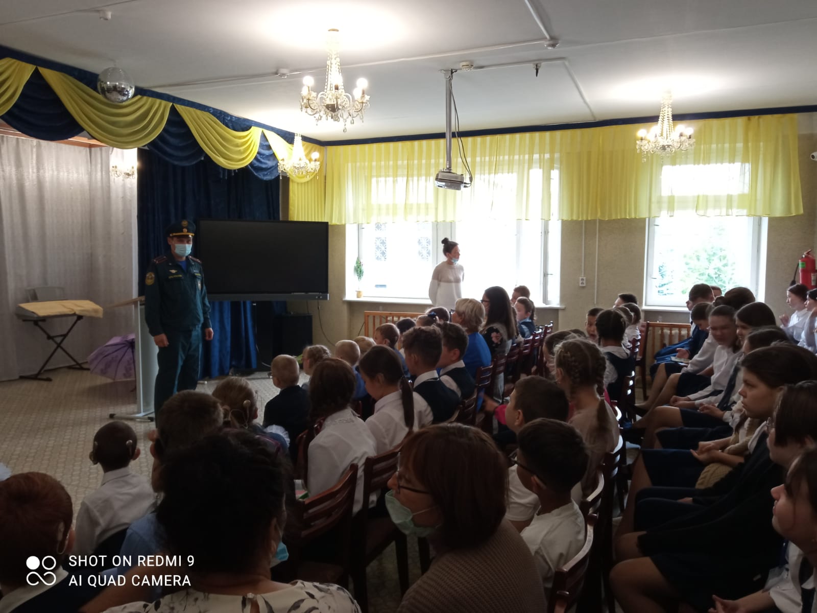 Лекция специалиста из 56 пожарно-спасательной части лейтенанта Тимергалиева Р.Р. для обучающихся 1-10 классов и педагогов