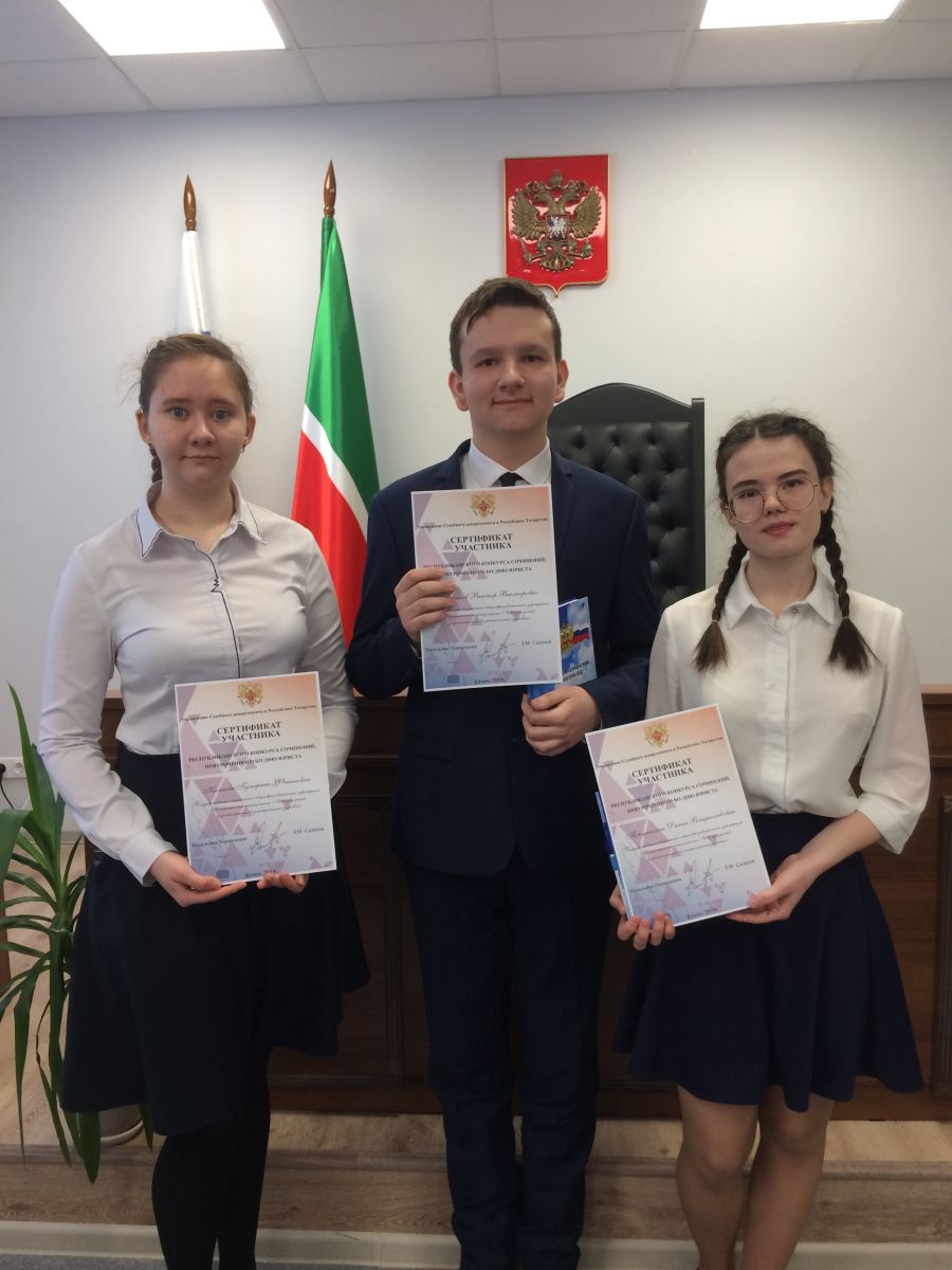 Опубликовано: 19.02.2020Членами жюри под председательством заместителя начальника Управления Судебного департамента в Республике Татарстан Алмаза Тагировича Ибрагимова были отмечены лучшие работы. Среди них сочинения ученика 9 класса и учениц 10 класса Государственного бюджетного общеобразовательного учреждения «Набережночелнинская школа №88 для детей с ограниченными возможностями здоровья» Шурокова Виктора, Гульфины Камаевой и Дианы Побединской (научные руководители – педагоги школы Васюткина З.А., Замахова Е.Д.)