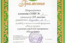 Городская программа «Имею право» 12.04.2016 Учащиеся 7Г под руководством классного руководителя Якуповой А.И. приняли участие в познавательной игре в рамках городской программы «Имею право» и заняли почетное 3 место. Молодцы!!!