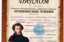 Всероссийский творческий конкурс «Пушкинские чтения» 24.03.2016 В Пушкинском лицее №78 прошел I Всероссийский творческий конкурс «Пушкинские чтения», в котором приняла участи ученица 9А класса Дементьева-Смелова Анастасия. Она представила исследовательскую работу по творчеству А.С. Пушкина. По итогам конкурса ей присудили 3 место. Научный руководитель: учитель русского языка и литературы Афанасьева Н.Г. Поздравляем!!!