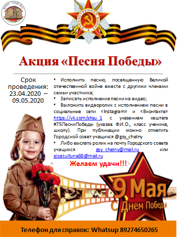 Запишите видео, как вместе со своей семьей поёте песню военных лет. Выложите ролик в Инстаграм или Вконтакте с хештегом #75ПесниПобеды или пришлите на почту Городского совета учащихся – gsy_chelny@mail.ru. Лучшие видео будут опубликованы в официальных аккаунтах ГСУ. Принять участие в флешмобе может любой желающий.
