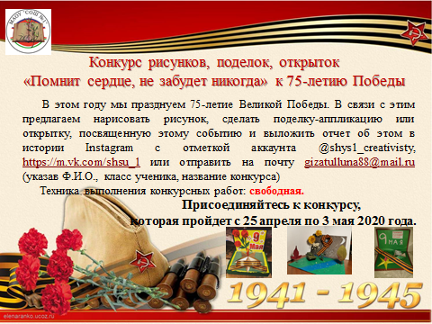 Конкурс рисунков, поделок, открыток «Помнит сердце, не забудет никогда» к 75-летию Победы 25.04.2020