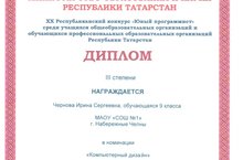 Поздравляем ученицу 9А класса Чернову Ирину, принимавшую участие в XX Республикансом конкурсе "Юный программист" и занявшую 3 место в номинации "Компьютерный дизайн"!!!!!!