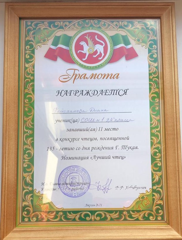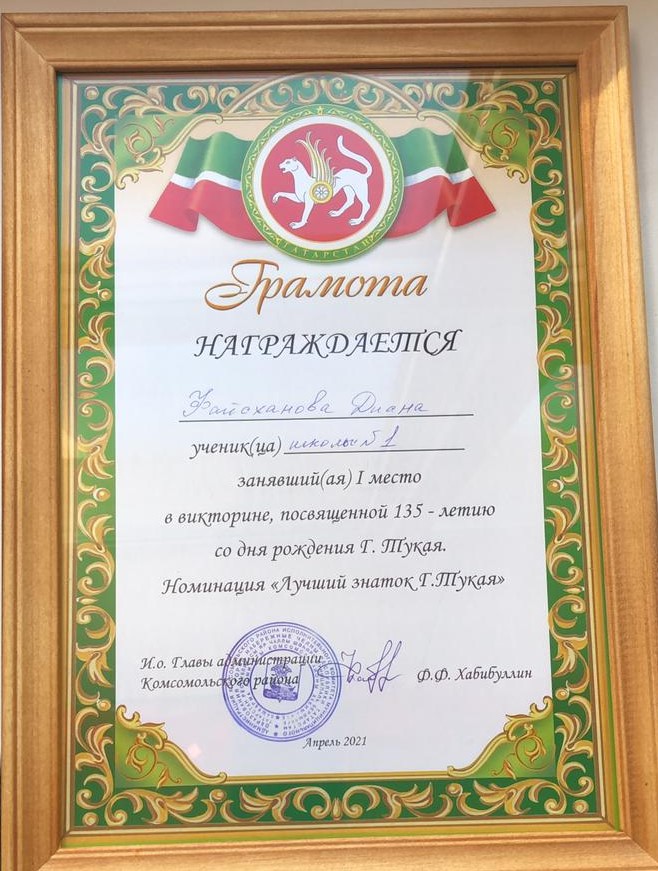Ученица 9А класса Файсханова Диана заняла 1 место в викторине, посвященной 135-летию со дня рождения Г. Тукая в номинации "Лучший знаток Г. Тукая" и 2 место в конкурсе чтецов в номинации "Лучший чтец"