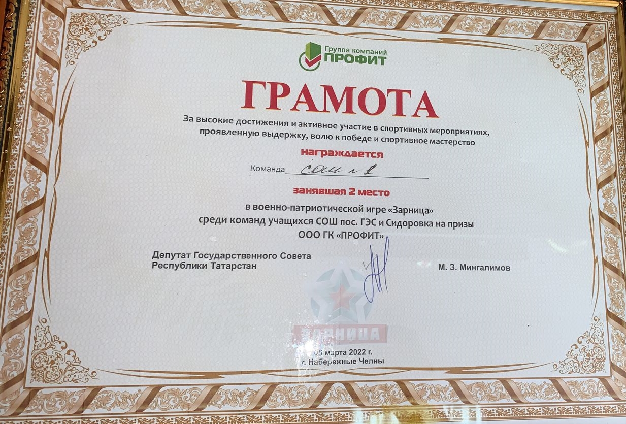 Опубликовано: 05.03.2022Команда МАОУ “СОШ №1” заняла 2 место в военно-патриотической игре “Зарница” среди команд учащихся СОШ пос. ГЭС и Сидоровка , за что была награждена Грамотой за высокие достижения и активное участие в спортивных мероприятиях, а также проявленную выдержку