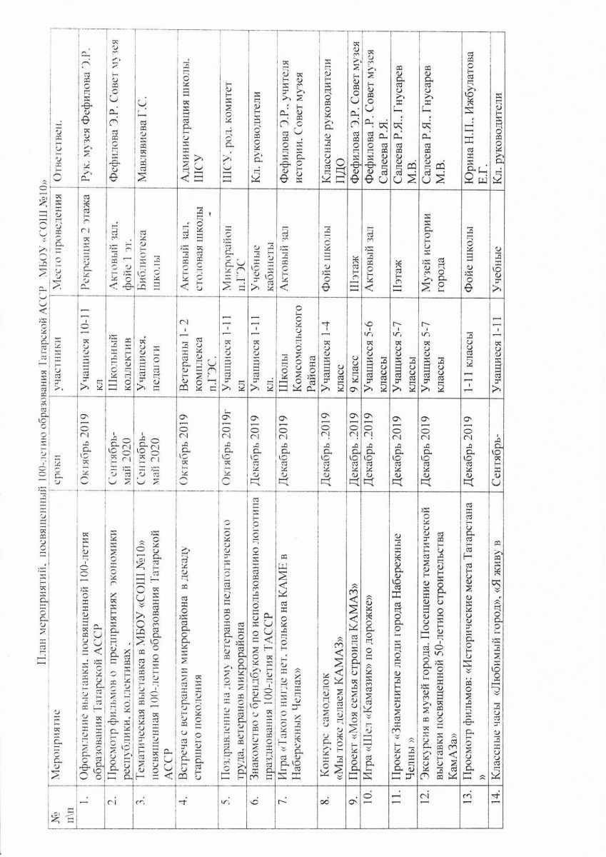 Опубликовано: 15.11.2019Дан старт проекту посвященному 100 - летию образования Татарской АССР. Составлен план проведения мероприятий на 2019 - 2020 учебный год