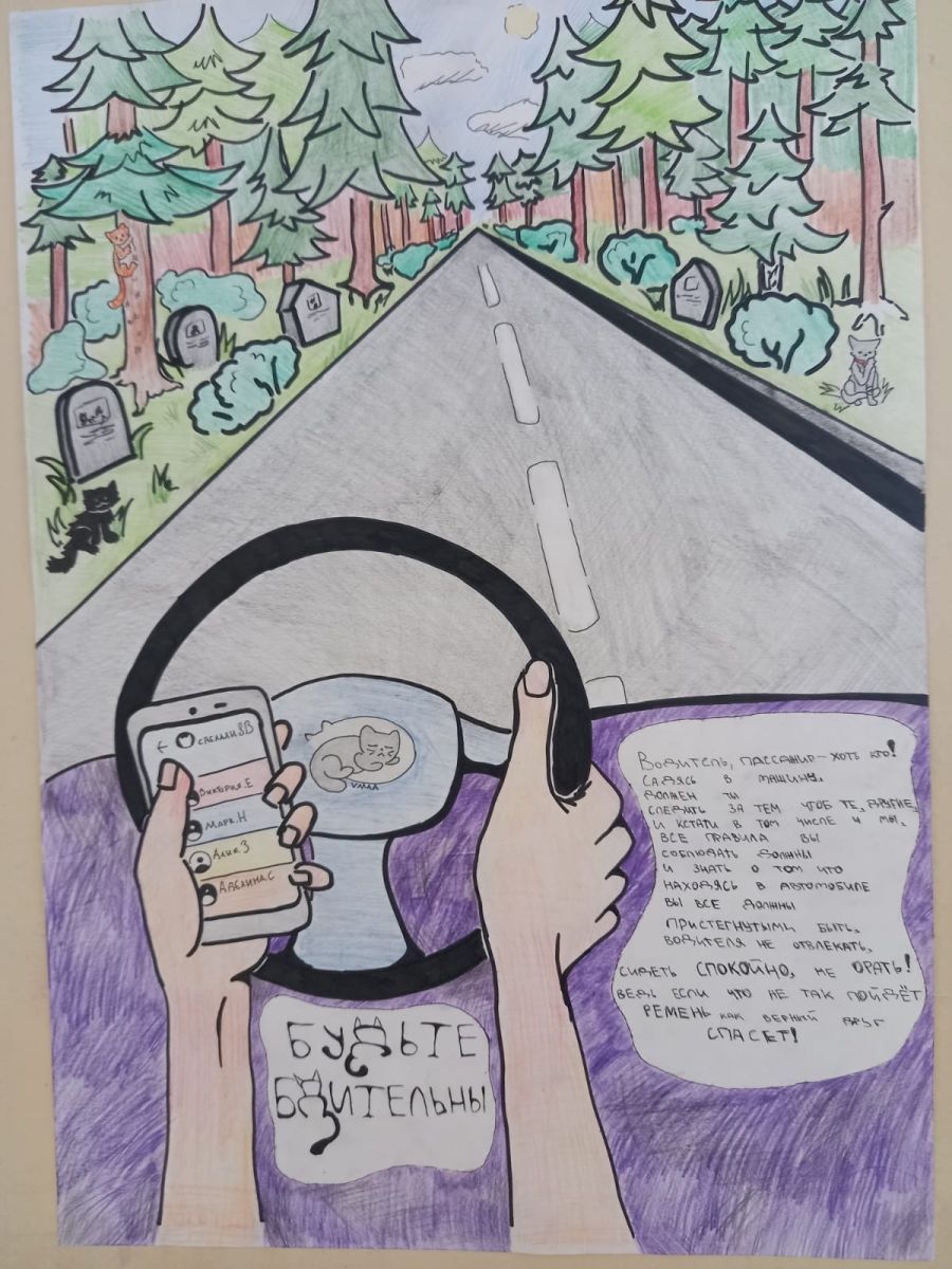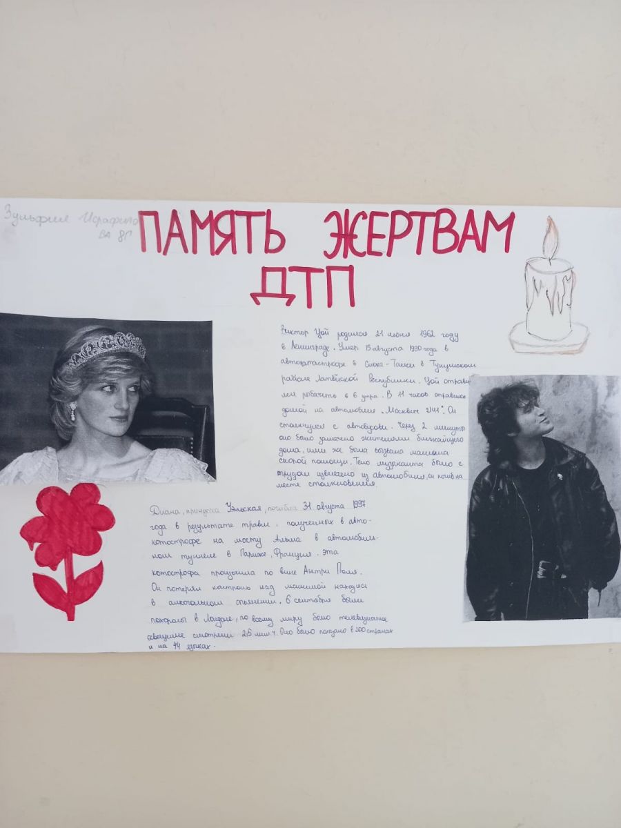 Опубликовано: 16.12.2023На прошедшей неделе в школе прошли мероприятия, посвященные Памяти жертв ДТП. учащиеся подготовили выставку рисунков, плакатов. Отряды ЮИД провели рейды по безопасности на дороге, подготовили агитационное выступление по необходимости соблюдения ПДД всеми участниками дорожного движения.