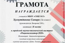 Поздравляем ученицу 4 "А" класса - Хуснутдинову Самиру со 2 местом в городском конкурсе научно-технической выставки "Рационализатор - 2020" -