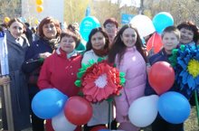 Участники праздничного шествия педагогов школы на первомайском демонстрации 01.05.2019