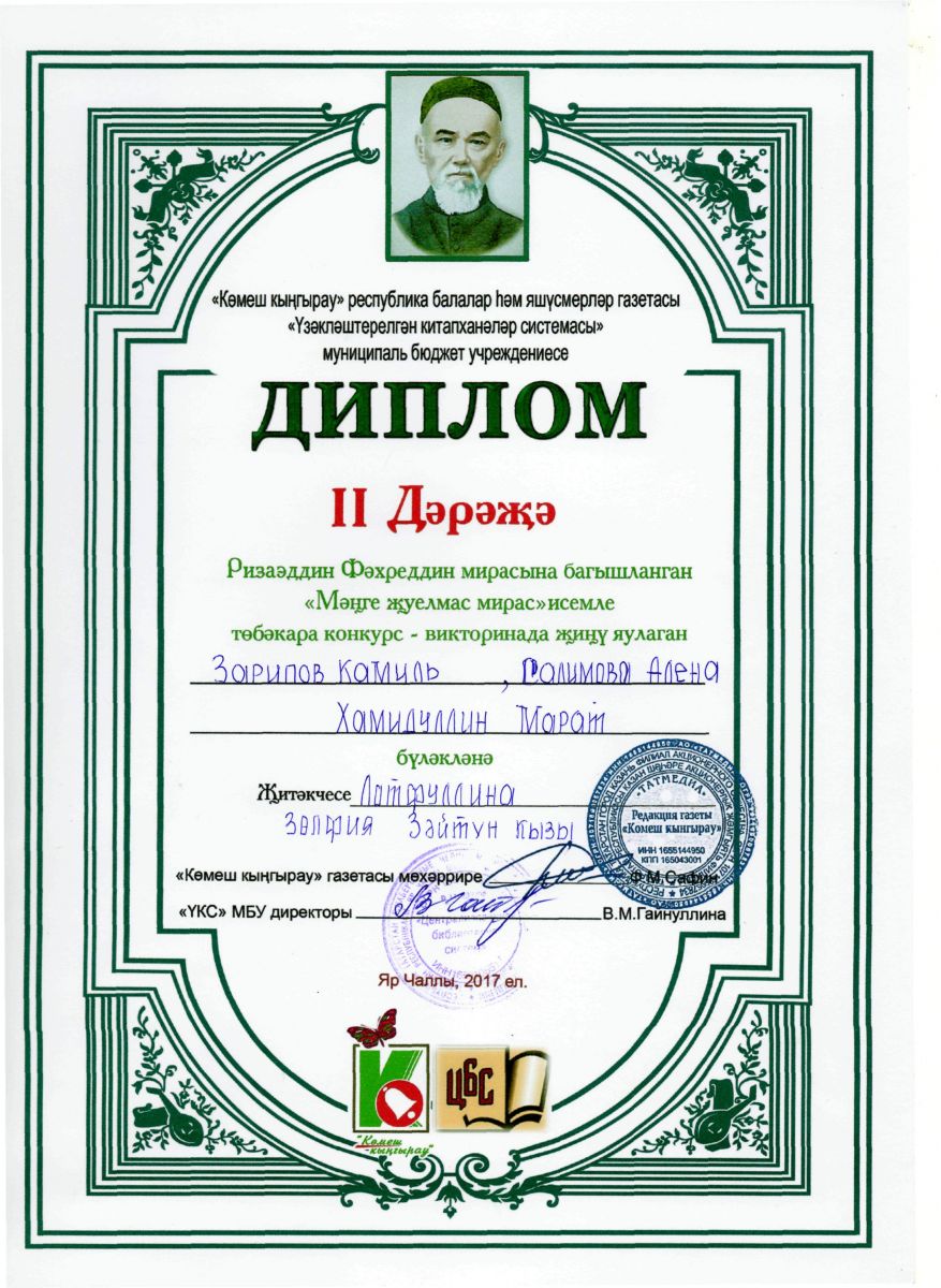 В 2017 году централизованная библиотечная система г. Набережные Челны совместно с редакцией республиканской детской газеты «Көмеш кыңгырау» организовали конкурс-викторину по наследию выдающегося татарского просветителя Ризаэддина Фахреддина на татарском языке «Мәңге җуелмас мирас» среди детей 13-15 лет. Вопросы викторины были размещены в номере 41 (21 октября) газеты «Көмеш кыңгырау», на сайте библиотеки и газеты. 24 ноября 2017 года в библиотеке-филиале №12 состоялось торжественное мероприятие, на котором победителям были вручены дипломы. Из средней школы №13 приняли участие учащиеся 7 А , 8Б классов. Зарипов Камиль (8Б кл.), Хамидуллин Марат (8Б кл.) , Салимова Алена (7 А кл.) под руководством учителя татарского языка Лотфуллиной Зульфии Зайтуновны получили диплом 2 степени. Амирова Аделя (7А кл.), Фролова Виктория (7А кл.) под руководством заведующей библиотеки Алюковой Риммы Рифгатовны были награждены дипломом 1 степени.
