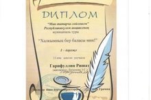 15 нче санлы Балалар иҗат йортында “Мин татарча сөйләшәм” республикакүләм акциясенең “Халкымның бер баласы мин!” дигән муниципаль турына нәтиҗәләр ясалды. Бу турда 7А сыйныфы укучысы 1 нче дәрәҗә диплом белән бүләкләнде. Ришатка иҗади уңышлар телибез.