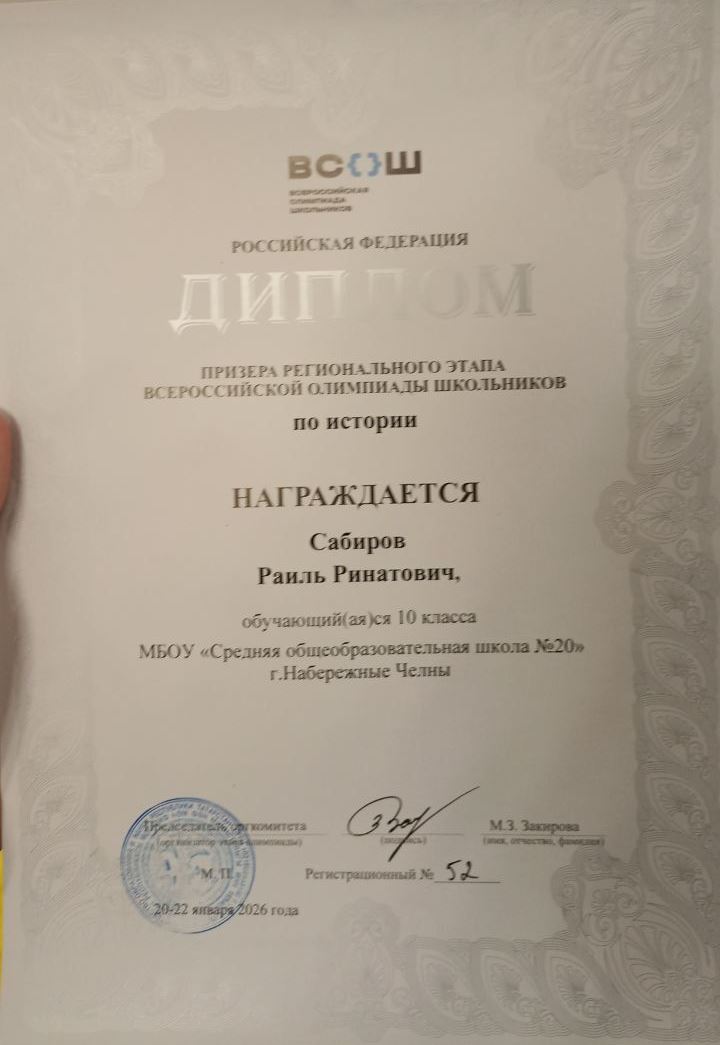 С 20-22 января 2026 года в Казани прошел региональный этап всероссийской олимпиады школьников по истории. Поздравляем ученика 10 «А» класса Сабирова Раиля и Учителя истории и обществознания Кузьмину Лидию Михайловну. Пусть каждый новый день приносит новые открытия и вдохновение для учебы!