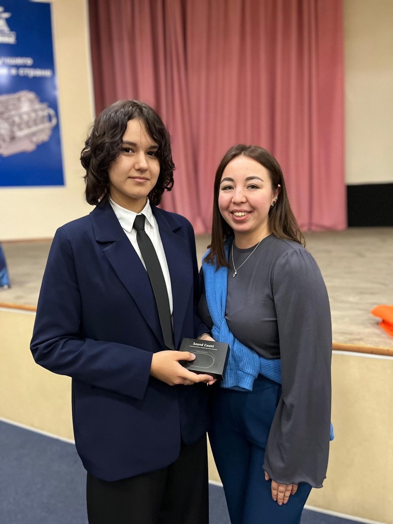 Ответив на все вопросы правильно, Председатель Совета Первых - Губайдуллина Эвелина выиграла портативную колонку!