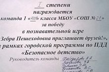 Поздравляем сборную команду 1-х классов (классные руководители: Хайдарова А.А., Афзалова З.А., Патенко Г.М., Тихонова В.С., Султанова С.Н.) с ПОБЕДОЙ в познавательной игре "Зебра Пешеходовна приглашает друзей" в рамках городской программы "Безопасное детство" 24.03.2016