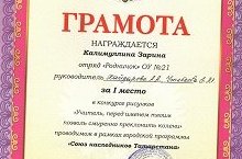 Поздравляем отряд «Родничок» (руководители Хайдарова А.А., Утябаева Е.М.) занявших 1 место в конкурсе рисунков «Учитель, перед именем твоим позволь смиренно приклонить колени» проводимом в рамках городской программы «Союз наследников Татарстана» 22.12.2014