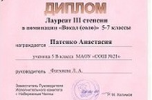 Поздравляем ученицу 5В класса Патенко Анастасию Лауреата III степени городского конкурса военно-патриотической песни "Ради жизни на Земле" 14.03.2014