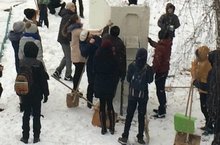 Весело и дружно учитель технологии Глушков Е. Г. и заместитель по АХЧ Шамсутдинов Р.Ю. с учащимися 3 класса проводят заливку катка.